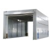整體移動(dòng)式噴漆間的設(shè)計(jì)目的,是為了滿足較大型工件 打磨或噴漆的需要。一般情況下每套房體對(duì)應(yīng)2~3個(gè)排風(fēng)凈化工位,哪個(gè)工位上的工件需要噴漆時(shí),房體則行走移動(dòng)到那個(gè)工位,其他工位可以繼續(xù)打磨工作,待 房體內(nèi)的工件噴漆完畢后,再控制移動(dòng)房體行走到打磨完畢后的工件工位,如此設(shè)計(jì)可以實(shí)現(xiàn)大型工件的不間斷連續(xù)噴漆工作。房體為鋼結(jié)構(gòu)構(gòu)造,房體立柱下面設(shè)置有兩臺(tái)電動(dòng)驅(qū)動(dòng)行走機(jī)構(gòu),行走機(jī)構(gòu)沿地面軌道行走。移動(dòng)房體兩端設(shè)置有電動(dòng)卷簾大門,房體行走時(shí),大門升起,待到達(dá)位置時(shí),大門降落關(guān)閉。大門與行走機(jī)構(gòu)由電氣控制部分連鎖控制,大門完全升起后,房體才可移動(dòng)行走。