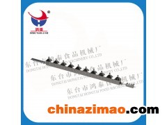 A.原料經(jīng)攪拌后投放入位于機器上方的鋪料機的料斗中(一次投放約5kg左右),鋪料機自動地將料均勻地鋪在輸送帶上,然后經(jīng)兩道壓輥壓制達到所需的厚度要求后送至宗、橫切刀進行切制成型,已切制成型的鍋巴再由過渡輸送帶均勻地鋪到由機器后方傳動的烘箱烘盤上,從而完成鍋巴的成型工序。