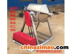 攪拌機360度旋轉,翻轉,攪拌機半中間有攪拌葉片。攪拌機運轉的時候攪拌葉片同時轉動,旋轉的雙錐筒使筒體內物料產生紊亂翻滾混合,高速旋轉的攪拌葉片打碎結團物料,使物料在筒體內快速混合