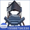 電液動犁式卸料器以電液動推桿為動力源,帶動框架前進(jìn),完成犁頭下落,并支承平托輥,犁刀下緣與膠帶貼合,完成卸料。完華后,框架后退,犁頭上抬,變形托輥恢復(fù)槽形,膠帶則則恢復(fù)槽形,物料平穩(wěn)通過。