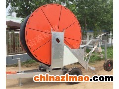 移動絞盤式噴灌機噴頭小車上裝有牽引杠、小車輪、噴頭架,噴頭架上裝有噴頭、配重體、輸水軟管;其特征在于,輸水軟管的另一端與管路連接,并直通PE管;主機架上裝有螺旋千斤頂、護罩、伺服機構、停機碰頭、支腿、收車架,大車輪裝在主機架的兩側;轉盤上裝有底座,底座上裝有右支架、左支架,左支架 側板上裝有直流可調式水蝸輪;水蝸輪的出水口與絞盤主軸管道相通,水蝸輪的入水口與輸水管快速管接頭相通;在快速管接頭上有一水壓表,水蝸輪的調整桿與速 度微調桿機構連接,自動停機連桿與減速器上的速度變 檔機構相連,減速器架上裝有速度表,減速器輸出軸上裝有制動器、左端小鏈輪,左端小鏈輪通過左端滾子鏈 傳動給絞盤上的大鏈輪;絞盤上纏繞PE管,絞盤主軸由 左右支架上的軸承支承,絞盤主軸右端上的小鏈輪通過 右端滾子鏈傳動給排管機構。