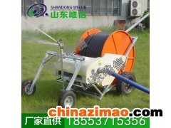 移動絞盤式噴灌機噴頭小車上裝有牽引杠、小車輪、噴頭架,噴頭架上裝有噴頭、配重體、輸水軟管;其特征在于,輸水軟管的另一端與管路連接,并直通PE管;主機架上裝有螺旋千斤頂、護罩、伺服機構、停機碰頭、支腿、收車架,大車輪裝在主機架的兩側;轉盤上裝有底座,底座上裝有右支架、左支架,左支架 側板上裝有直流可調式水蝸輪;水蝸輪的出水口與絞盤主軸管道相通,水蝸輪的入水口與輸水管快速管接頭相通;在快速管接頭上有一水壓表,水蝸輪的調整桿與速 度微調桿機構連接,自動停機連桿與減速器上的速度變 檔機構相連,減速器架上裝有速度表,減速器輸出軸上裝有制動器、左端小鏈輪,左端小鏈輪通過左端滾子鏈 傳動給絞盤上的大鏈輪;絞盤上纏繞PE管,絞盤主軸由 左右支架上的軸承支承,絞盤主軸右端上的小鏈輪通過 右端滾子鏈傳動給排管機構。