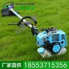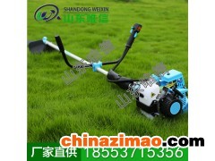 側掛式草坪機采用硬軸傳動, 主要由發動機、 傳動系統、離合器、工作部件、操縱裝置和側掛皮帶等組成。在傳動軸的一端配置0.75~ 2千瓦的單缸二沖程風冷汽油機和離心式摩擦離合器;另一端安裝由減速器和切割刀具組成的工作部件。工作部件的類型很多,常用得為圓鋸片、刀片或尼龍絲。作業時,將傳動軸的鋁合金套管上的鉤環掛在操作者肩下的背帶上,握住手把,橫向擺動硬軸,即可完成切割雜草、灌木等作業。機具重約6~12千克,轉速約4500~5000轉/分。